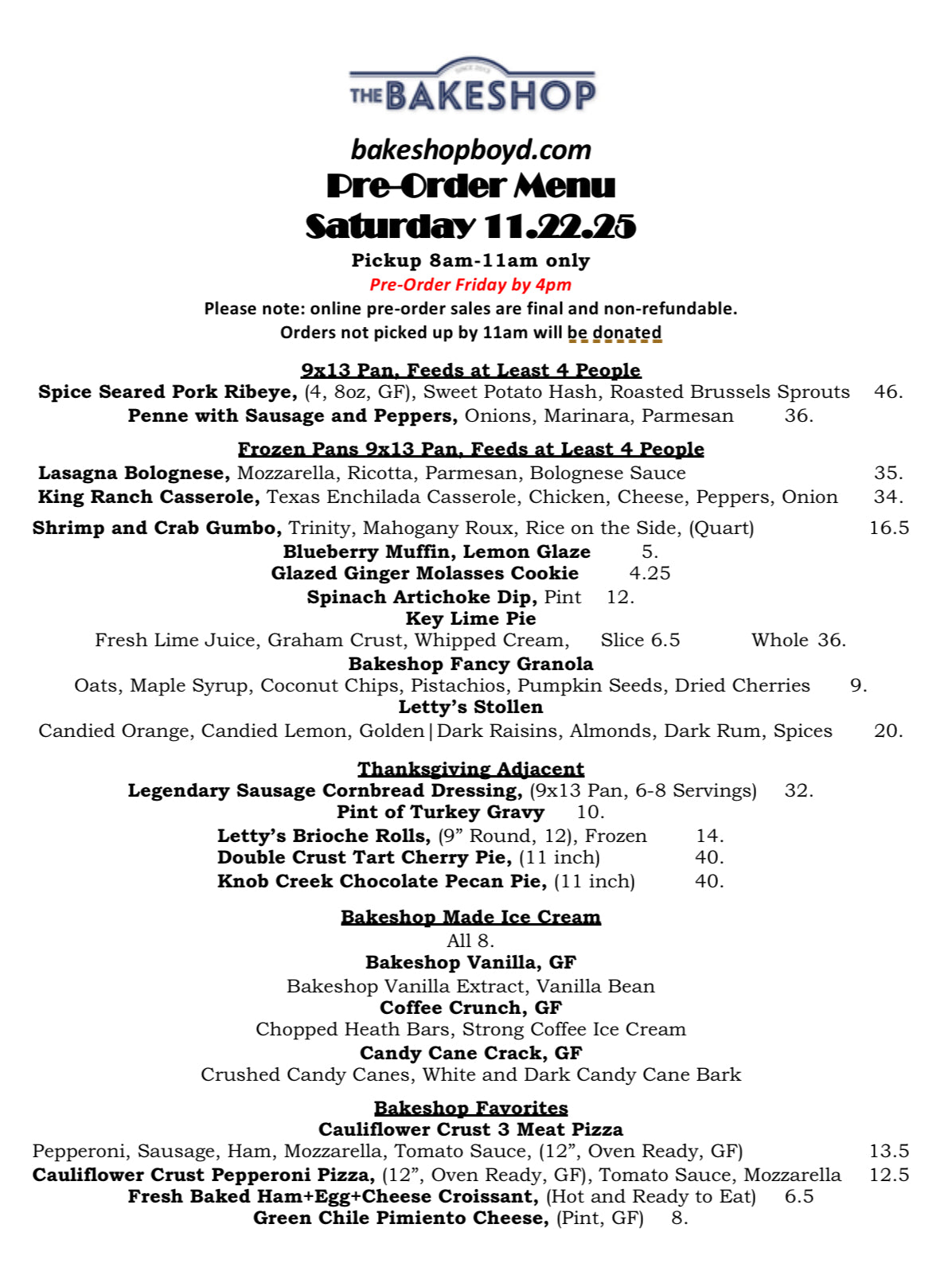 Thanksgiving pick up 11.26 from 10am until 2pm only